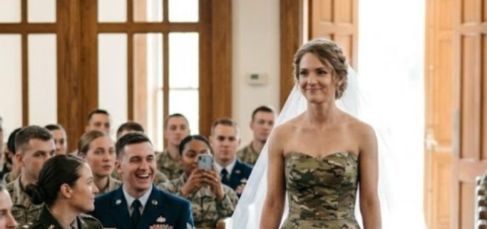 Da kirkedørene endelig åbnede sig, var min brud ikke iført hvidt. I stedet havde hun en kjole på, der udelukkende var lavet af militærskjorter. Der blev stille i